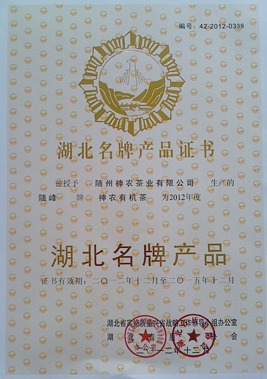 2012年12月神農(nóng)有機(jī)茶被命名為2012年度湖北名牌產(chǎn)品