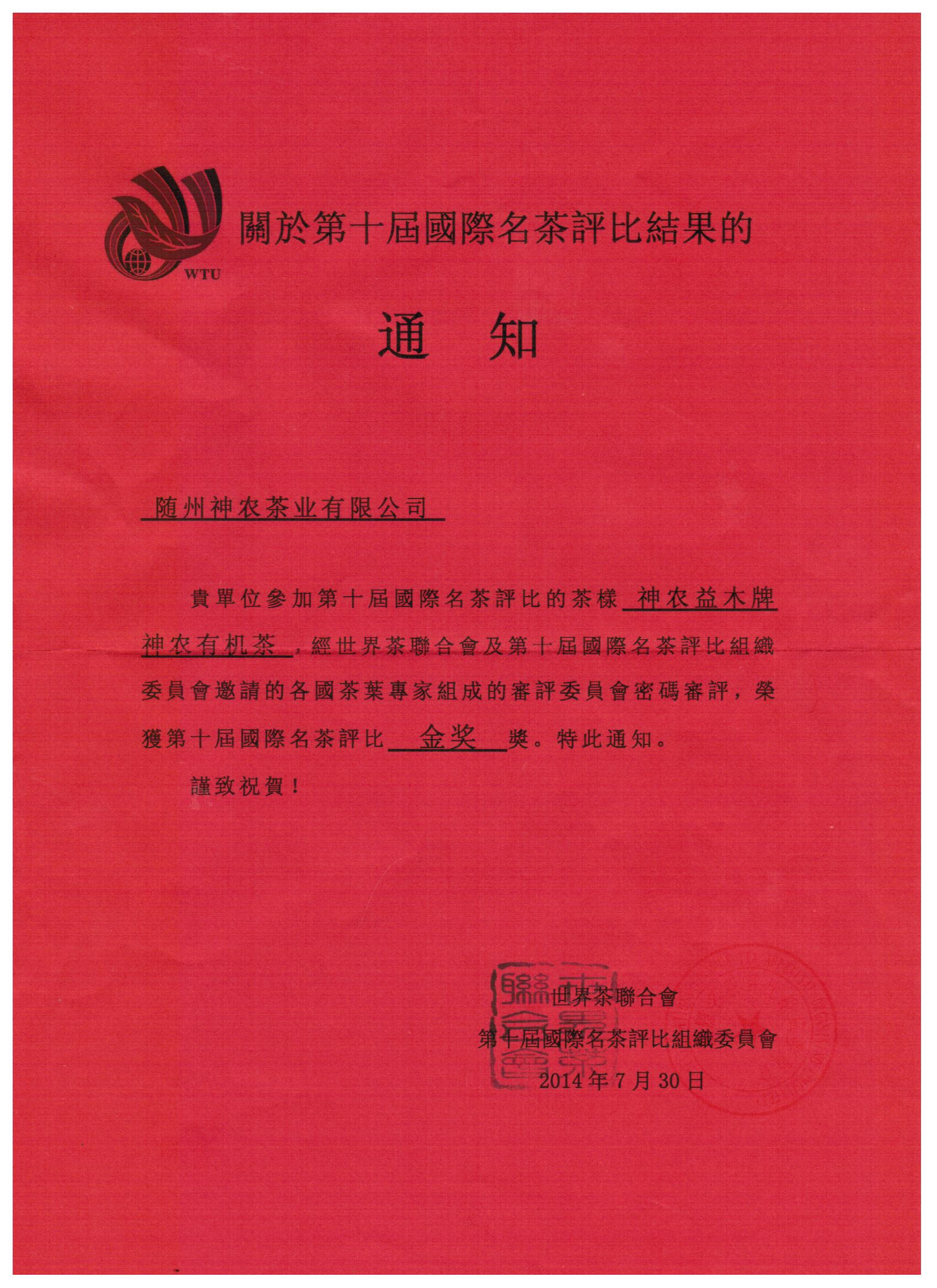 神農(nóng)有機茶"再次榮獲第十屆國際名茶評比"金獎"