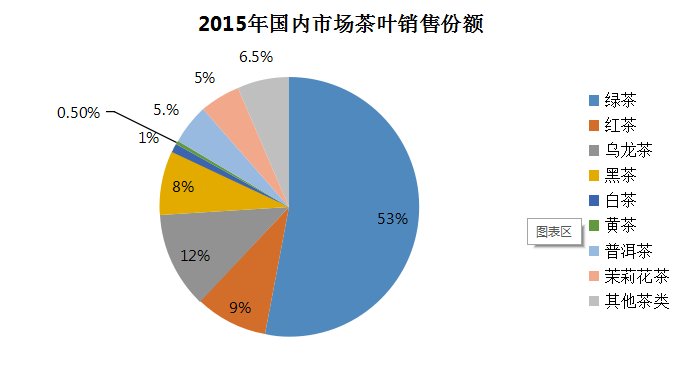 在六大茶類占比中,2015年綠茶、烏龍茶比例略有下調(diào)分別為0.84%和36%.白茶、紅茶、黑茶比例都有不同程度的上升,分別為0.22%、0.41%、0.57%。