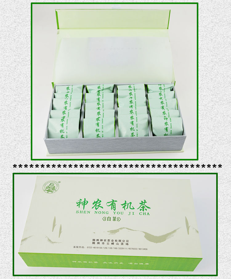 神農(nóng)有機(jī)茶系列之——白茶,采用綠茶加工工藝,選一芽二葉初展的白茶嫩葉為原料,經(jīng)殺青、理?xiàng)l、烘干、提香等工藝加工而制成,屬綠茶類。有機(jī)白茶外形挺直略扁,形如蘭蕙;色澤翠綠略帶金黃,白毫顯露;葉芽如金鑲碧鞘,內(nèi)裹銀箭。沖泡后,清香高揚(yáng)且持久,湯色嫩綠明亮,滋味鮮醇、馥郁,清潤(rùn)甘爽,飲畢,唇齒留香,回味甘而生津。葉底嫩綠明亮,葉白脈翠,芽葉朵朵,十分可人。